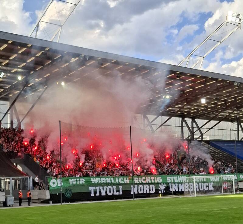 Wir feierten am letzten Wochenende das zehnjährige Bestehen unseres Jassvereines mit einer Reise nach Innsbruck. Die Jasskasse musste geleert werden. Um dieses Unterfangen zu bewerkstelligen, waren VIP Tickets beim letzten Heimspiel der Saison vom FC Wacker Innsbruck gerade richtig. 50 Euro pro Person zeigte das Preisschild an. Was dabei inbegriffen war, wussten wir nicht, wir liessen uns überraschen. Das Wetter sollte an diesem Wochenende mitspielen und die ÖBB brachte uns pünktlich ins Tirol. Nach dem Zimmerbezug und einer ersten Stärkung konnte das Wetter mit Bier genossen werden. Bier sollte an diesem Wochenende irgendwie das Zentrum unseres Handels sein. Hin und wieder liefen uns einige Fussballfans mit schwarz-grünen Trikots über den Weg. Nach langer Zeit sollte an diesem Spieltag gegen den SV Kematen auch endlich mal wieder die Fankurve hinter dem Tor geöffnet sein. Das Tivoli Nord gefiel an diesem Samstag mit einem sehr starken Support. Zipfer brachte für dieses Spiel ein spezielles Bier raus. Je länger das Bier im Glas war, desto mehr veränderte sich die Farbe. Aus dem gewohnten Bierton wurde schonmal ein grünes Getränk. Unsere Truppe kostete im VIP Bereich so ziemlich alles Mögliche durch. Irgendwann kamen wir auf die Erkenntnis, dass der FC Wacker wohl nicht sehr viel an uns verdient hatte. Diese 50 Euro waren eher für uns ein sehr gutes Geschäft und da nach dem Spiel noch das Champions League Finale auf den Bildschirmen lief, machte auch niemand die Anstalten mit dem Bierzapfen und Essen auftischen aufzuhören. Die heimische Mannschaft gewann verdient mit 3 zu 0 und feierte sich nach dem Spiel vor dem Tivoli Nord. Über 4000 Fans waren im Stadion. Für mich war es der dritte Besuch im Tivoli Stadion. Die letzten Besuche liegen jedoch 19 beziehungsweise 20 Jahre zurück. Beide Male durfte ich im EM Stadion von 2008 damals Rapid Wien als Gegner bestaunen, dies zeigt stellvertretend die bewegende Geschichte von Wacker Innsbruck.